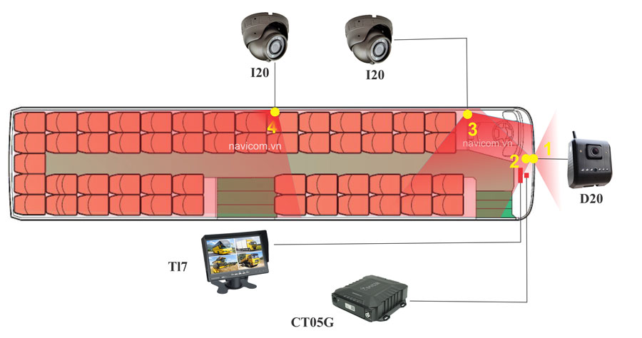 Hệ thống 4 camera giám sát hợp chuẩn NGHỊ ĐỊNH 10 cho xe khách - bus trên 30 chỗ ngồi Navicom HTB04-ND10 gồm: