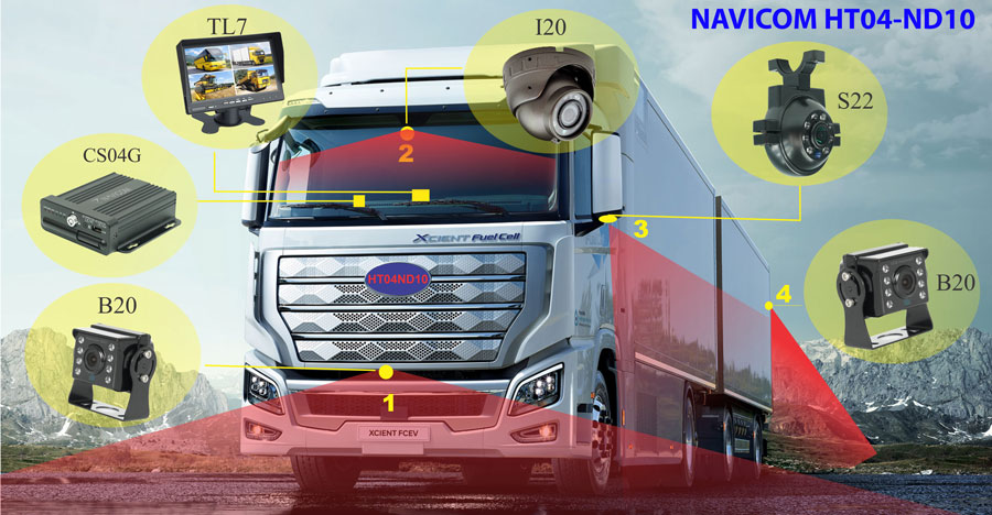 Hệ thống 4 camera giám sát hợp chuẩn cho xe đầu kéo & xe container Navicom HT04-ND10 gồm: 01 đầu ghi Navicom CS04G, 02 Camera Navicom B20, 01 camera Navicom I20, 01 camera Navicom S22, 01 màn hình taplo Navicom TL7