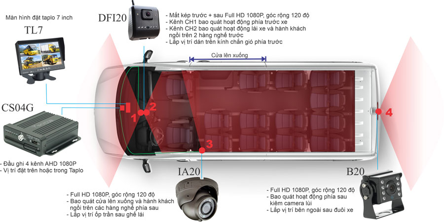 Thiết kế lắp đặt hệ thống camera giám sát xe khách 24 chỗ đến 29 chỗ ngồi như sau:
