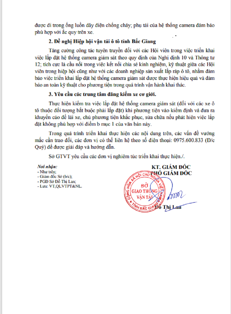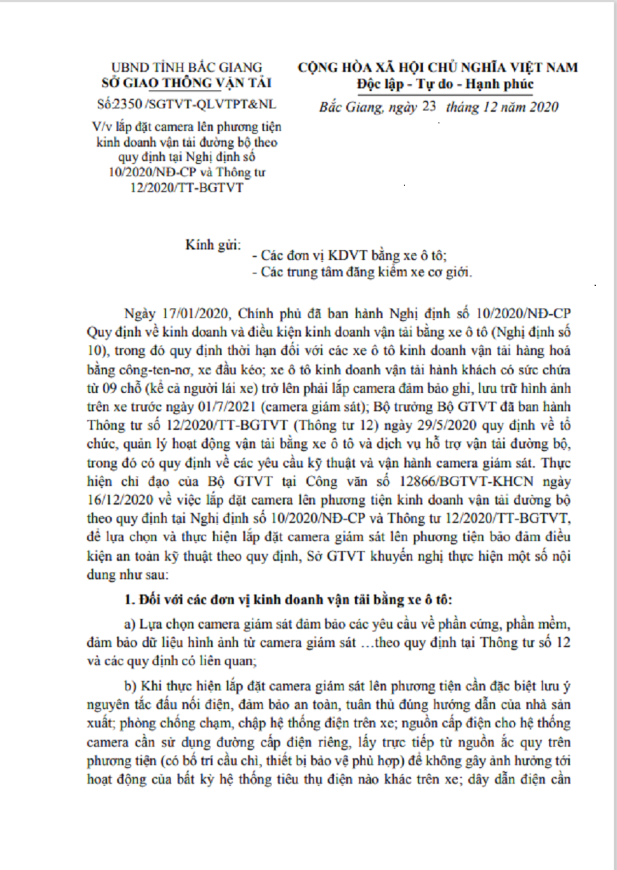 2. Thông báo của Sở giao thông Vận tải tỉnh Bắc Giang về việc lắp camera Nghị định 10?