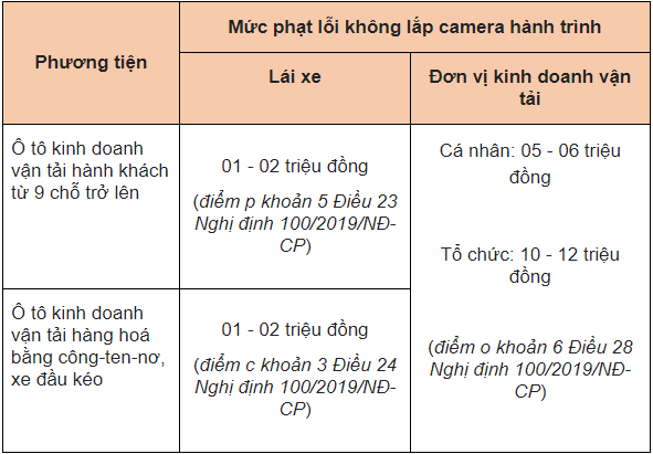 Trả lời: Theo quy định tại nghị định 100/2019/NĐ-CP xe container đầu kéo hoặc xe khách thuộc diện phải lắp camera theo nghị định 10 nhưng không lắp hoặc có lắp nhưng camera không hoạt động thì mức phạt là từ 1 -2 triệu đồng đối với lái xe, cá nhân kinh doanh vận tải chịu mức phạt từ 5-6 triệu đồng, tổ chức mức phạt từ 10-12 triệu đồng.